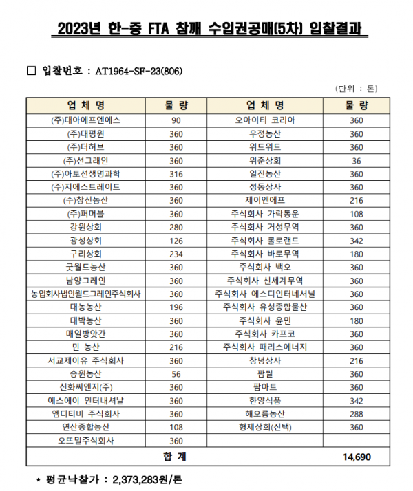 Re: [입찰결과] 총낙찰: 14,690톤, 평균낙찰가: 2,373,283원/톤 페이지 정보 작성자 KAFCO 작성일23-09-06 19:10 조회2,262회 댓글0건 관련링크 이전글 다음글 목록 본문 [입찰결과] 총낙찰: 14,690톤, 평균낙찰가: 2,373,283원/톤 댓글목록 등록된 댓글이 없습니다. 이전글 다음글 목록