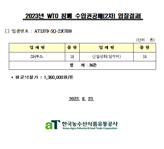 Re: [입찰결과] 총낙찰: 36톤, 평균낙찰가: 1,360,000원/톤 페이지 정보 작성자 KAFCO 작성일23-08-23 17:34 조회2,395회 댓글0건 관련링크 이전글 다음글 목록 본문 [입찰결과] 총낙찰: 36톤, 평균낙찰가: 1,360,000원/톤 댓글목록 등록된 댓글이 없습니다. 이전글 다음글 목록