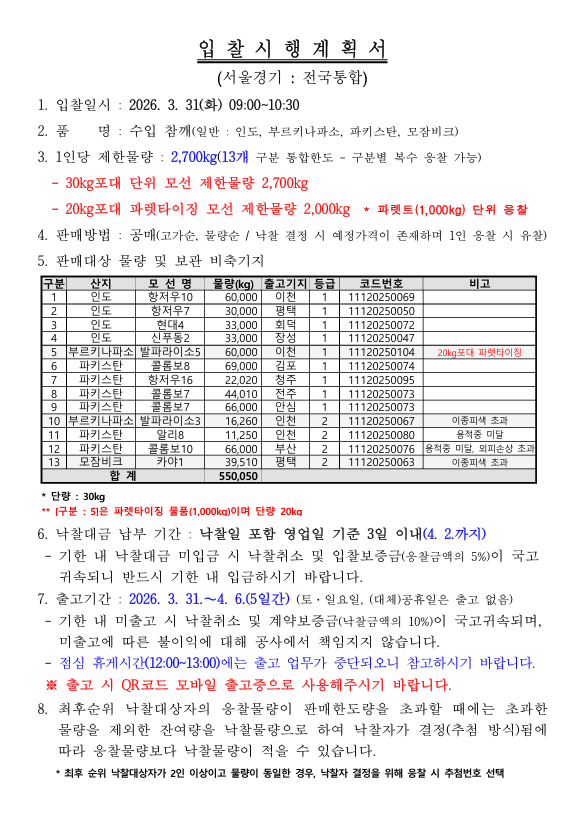 [비축공고] 비축일자:2026-03-31 페이지 정보 작성자 KAFCO 작성일26-03-27 08:44 조회1회 댓글0건 관련링크 다음글 목록 본문 [비축공고] 비축일자:2026-03-31 댓글목록 등록된 댓글이 없습니다. 다음글 목록