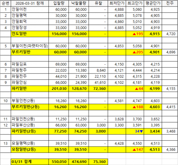 Re: [비축결과] 총입찰 : 550,050kg, 총낙찰 : 474,690kg 페이지 정보 작성자 KAFCO 작성일26-03-31 10:49 조회1회 댓글0건 관련링크 이전글 다음글 목록 본문 Re: [비축결과] 총입찰 : 550,050kg, 총낙찰 : 474,690kg 댓글목록 등록된 댓글이 없습니다. 이전글 다음글 목록