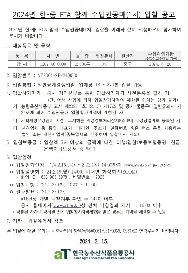 [입찰공고] 한중FTA 참깨 수입권공매(1차) 입찰공고
